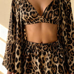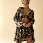 De Felina satijnen set heeft een wilde maar verfijnde stijl met zijn intense luipaardprint. Het bestaat uit een niet-geverste bralette, vloeiende shorts en een geknoopte kimono, en belichaamt ontspannen elegantie. De zachte satijn glijdt licht over de huid terwijl de getailleerde snits de silhouet accentueren. De lange kimono kan open of gestrikt om de taille worden gedragen voor een veelzijdige look, afhankelijk van je stemming. Perfect voor een chique cocoonochtend of een ontspannen avond, deze luipaard lingerie set combineert comfort en karakter met een duidelijk vrouwelijke touch.
