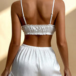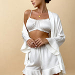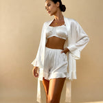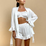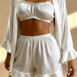 De Angie set bestaat uit een gerimpelde top, frilly shorts en een bijpassende vloeiende kimono.