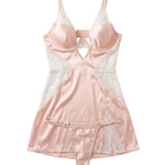 Het Blossom satijnen nachthemd betovert met zijn spel van transparantie en strategische uitsparingen. Gemaakt van zacht poederroze satijn, heeft het brede panelen van witte bloemenkant die de taille en zijkanten accentueren. De diepe halslijn met een centrale uitsparing benadrukt de buste, terwijl de zijsplitten subtiel de benen onthullen. De open rug voegt een gedurfde dimensie toe aan dit delicate stuk. Geleverd met een bijpassende string, belichaamt dit korte lingerie nachthemd de perfecte balans tussen romantische zachtheid en zelfverzekerde sensualiteit.
