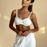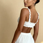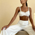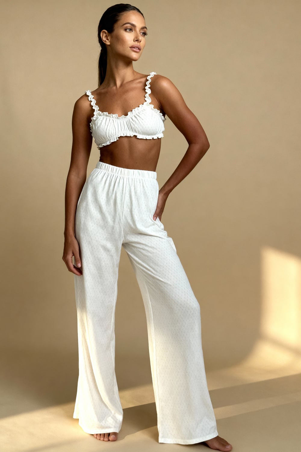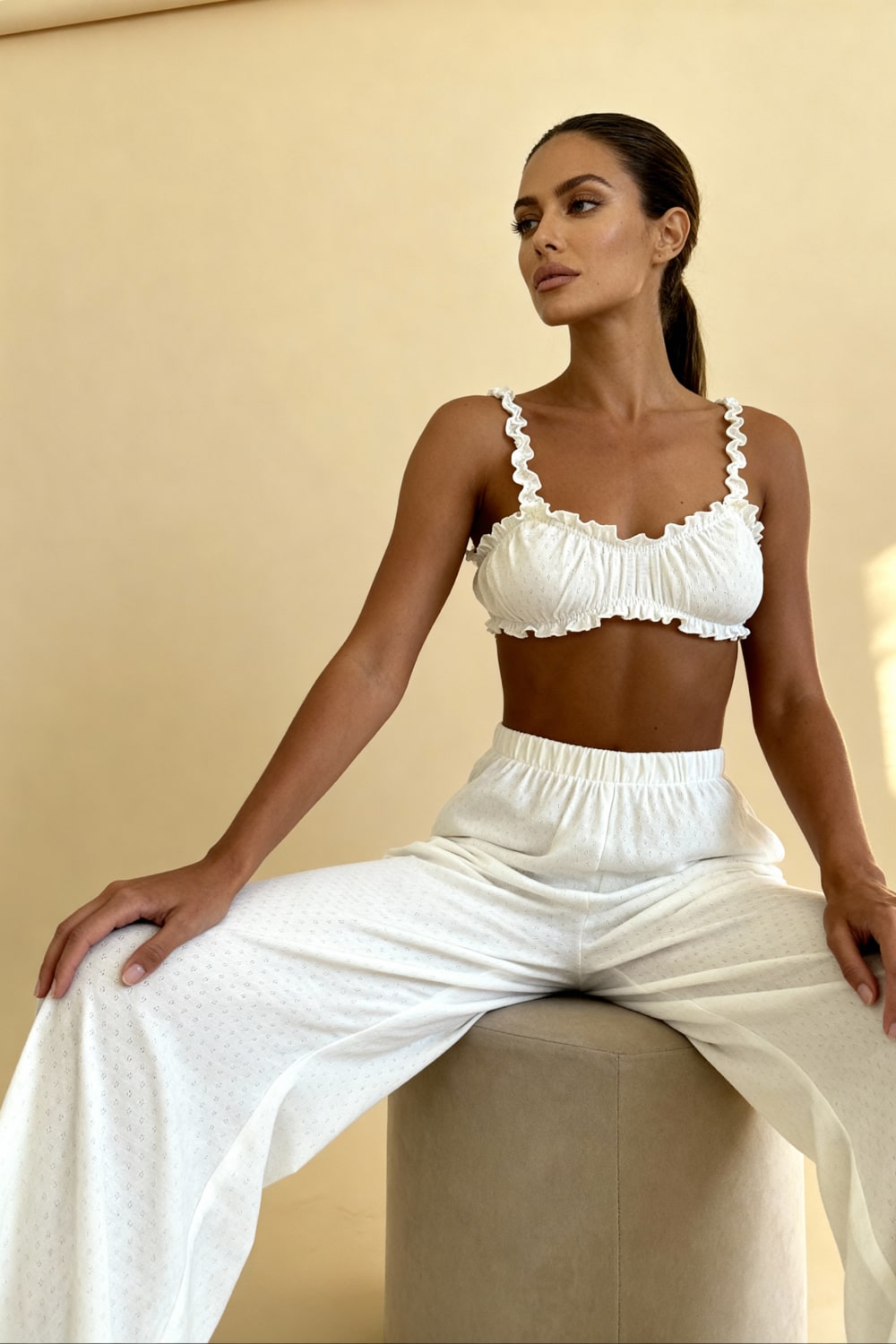Het Elisa loungewear set combineert comfort en zomerse elegantie met zijn gerimpelde bralette-top en vloeiende broek. Gemaakt van een lichtgewicht Engelse borduurstof, omarmt het zachtjes het lichaam terwijl het de huid laat ademen. De delicate ruches langs de halslijn en bandjes voegen een romantische en vrouwelijke toets toe. De hoge taille, wijde broek biedt totale bewegingsvrijheid, perfect voor ontspannen dagen of zomeravonden. Een veelzijdig set dat zowel op het strand als in de stad kan worden gedragen.