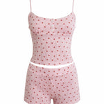De Juliette pyjama betovert met zijn rode kersprint op een zachte roze achtergrond en delicate geborduurde details. Het topje heeft een met kant afgewerkte halslijn en een centrale knoopsluiting versierd met kleine witte knopen, terwijl de bijpassende shorts een aansluitende en comfortabele snit bieden. Gemaakt van een zachte, licht gestructureerde stof die het lichaam zachtjes omarmt, combineert deze retro lingerie set romantische stijl met absoluut comfort. Perfect voor zoete nachten of charmante, ontspannen ochtenden.