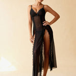De lange Abby nachtjapon onthult een vloeiende en sensuele snit, versterkt door zijslitsen afgewerkt met kant.
