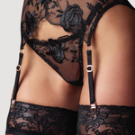 • Bijpassende string en kousenband met ingewikkelde bloemenborduursels