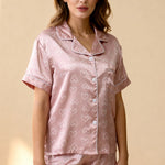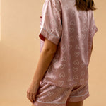 De Satin Pyjama Sweetness herinterpreteert comfort met zijn witte hartjesprint op een poederroze achtergrond. Gemaakt van lichtgewicht, vloeiende satijn, glijdt het zachtjes over de huid terwijl het een romantische touch toevoegt. Het kortarmige shirt met kraag sluit met een centrale knoopsluiting, terwijl de bijpassende shorts een comfortabele en vrouwelijke pasvorm bieden. De contrasterende witte afwerkingen op de randen en het kleine borstzakje voegen een verfijnd detail toe. Perfect voor gezellige avonden of rustige ochtenden, deze satijnen pyjama set combineert elegantie en welzijn.