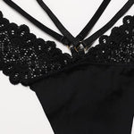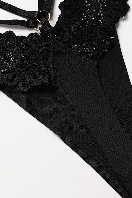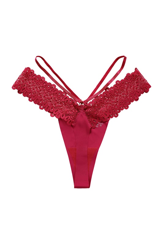 Een verleidelijke string die een gedurfde snit combineert met delicate crossover banden om de heupen te accentueren. De bloemige kant voegt een elegante en sensuele toets toe, terwijl de dubbele banden en de centrale ring een gedurfde en moderne noot geven.