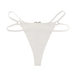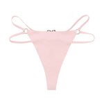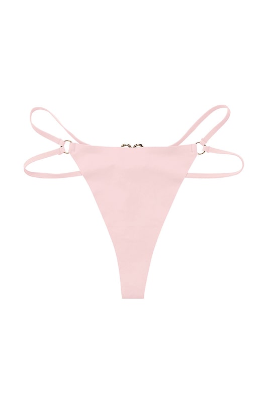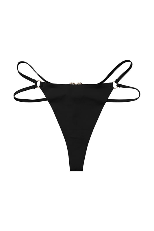 Gestroomlijnde string van zachte microvezel, ontworpen om de heupen te accentueren met zijn verstelbare dubbele bandjes. Aan de achterkant accentueert een gouden hartvormige juweel de onderrug met sensualiteit. String model, tweede huid effect, verkrijgbaar in zwart, wit en poederroze.