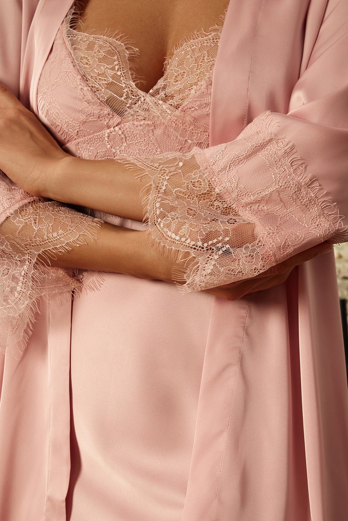 Ontdek onze pyjama's die comfort en elegantie combineren. Perfect voor zoete en stijlvolle nachten. De set bevat een badjas en een nachthemd.